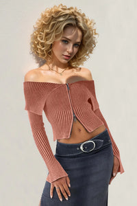 Double Take Ribbed Off-Shoulder Zip Up Long Sleeve Cardigan