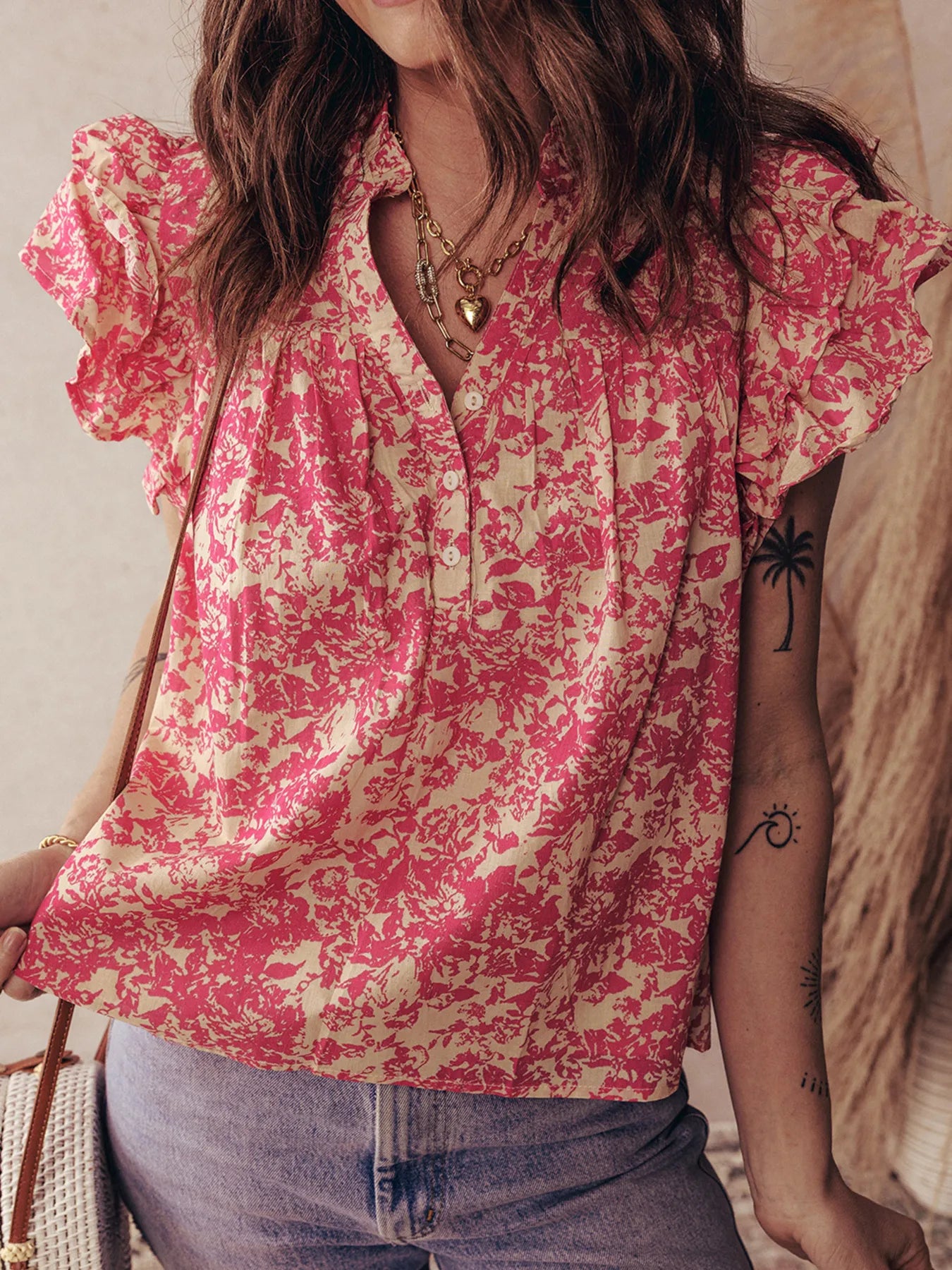 Printed Half Button Neck Ruffle Sleeve Blouse